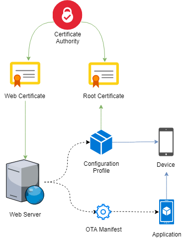 The end goal is to install the Application (a .ipa file built from Xcode) onto the device. This will be served by the Web Server, but iOS can’t install it directly from the browser.