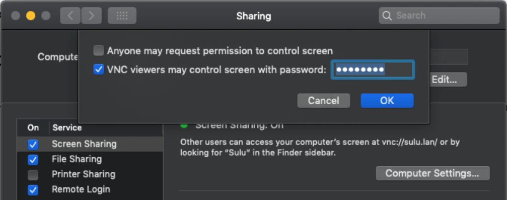 Set up screen sharing on the Mac with usual settings, including a password. Also ensure Remote Login is enabled for SSH access.