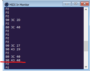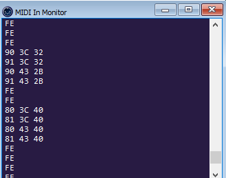 FEis a regular polling status byte that fires a couple of times a second.90 3C 2Dis a key press event (90) of the key3Cwith velocity2D.80 3C 40is the same key being released (80) – the velocity (40) is irrelevant for my keyboard.